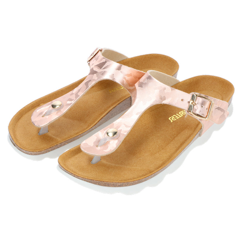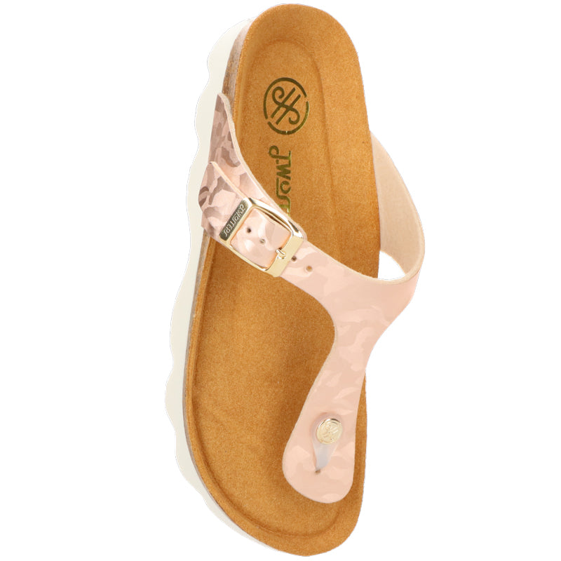 Die Twosteps Thong in glänzender Camouflage-Optik sind ein echter Hingucker und machen jedes Outfit zu etwas besonderem. Die goldenen Schnallen und die dazu passenden Zehentrenner verleihen den Schuhen zusätzlich einen hochwertigen Touch. Durch das einzigartige Wellendesign an der Sohle sind die Twosteps die perfekte Ergänzung zu deinem Sommerlook.